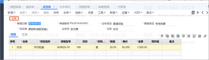 2) 当收到 1000 元的 B 供应商来货时,做一张进货单,如图所示: