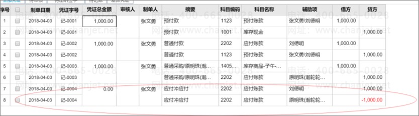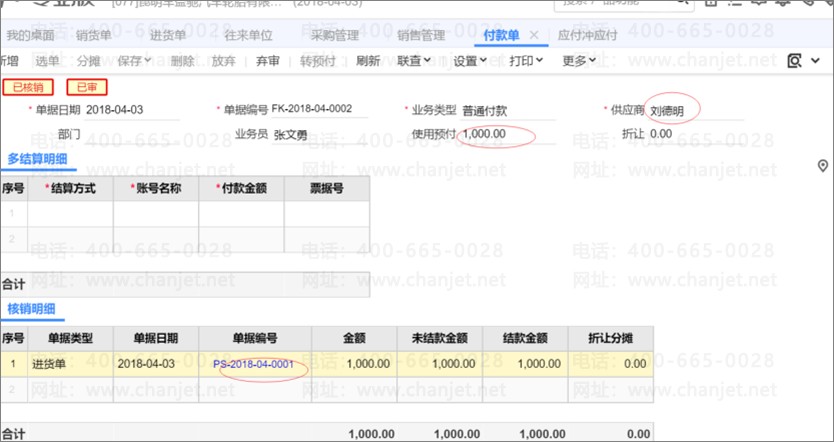 4) 在付款单中用 A 供应商的预付款核销 A 供应商的应付账款,如图所示: