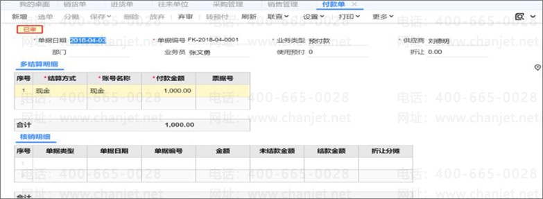 1) 当客户向 A 供应商预付一笔货款时,按实际业务做一张付款单,如图所示: