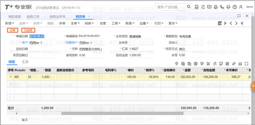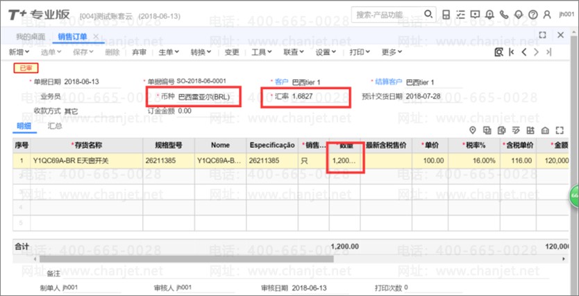 1、做销售订单,在单据表头录入客户、币种为 BRL,汇率会自动带出本月(6 月,这里假设采用月汇率)汇率;在表体选择商品、数量会自动带出价格(也可以手工录入)