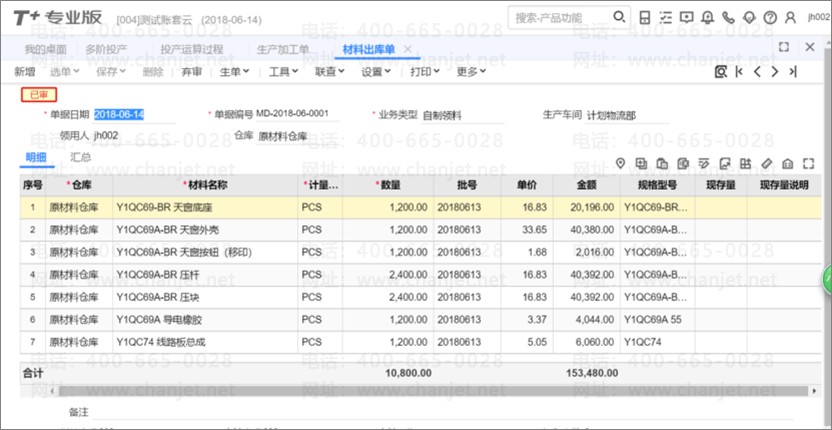 8、 进行领料生产,做[材料出库单]