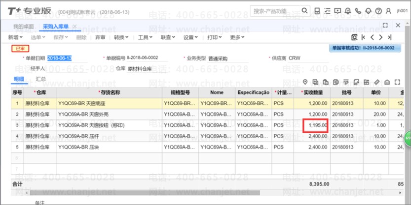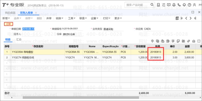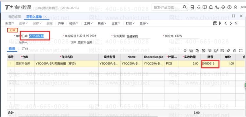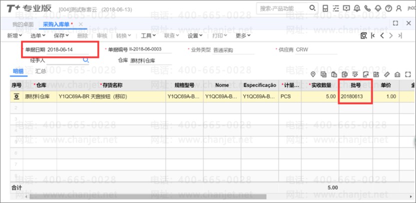5、货物到达后,进行入库,产品批号会自动带出