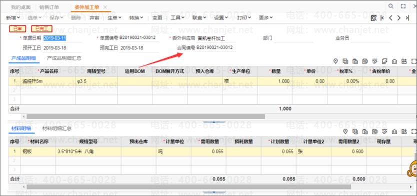 根据客户订单制定合同编号,按照合同编号进行生产销售。不同的合同生产的相同产品往往不能区分,不能知道停留哪道工序。不同合同编号可以转换凑齐发货。