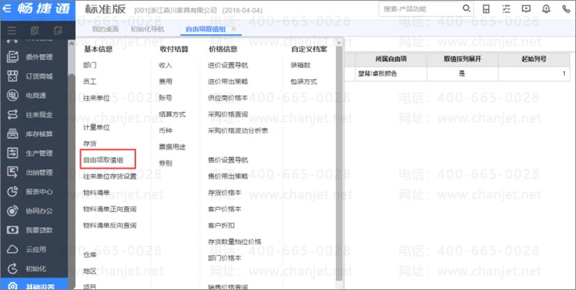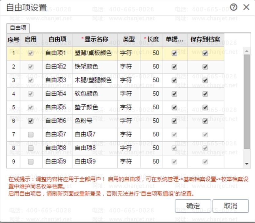 1)如图所示,在[系统管理]的[基础档案设置]中启用存货自由项,并在[枚举档案设置]