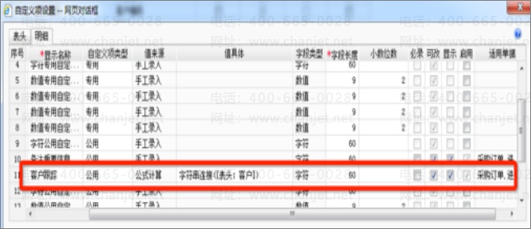 解决方式是:在销售订单的表体明细上启用公共自定义项,值来源为公式,取值为表头的客户信息字段,实用单据是 销售订单、采购订单、采购入库单、进货单。这样就可以在采购订单和采购入库单上都能体现销售订单的顾客信息,并且根据销售订单合并生成采购订单,合并入库单都没有问题,都可以实现明细的顾客信息显示