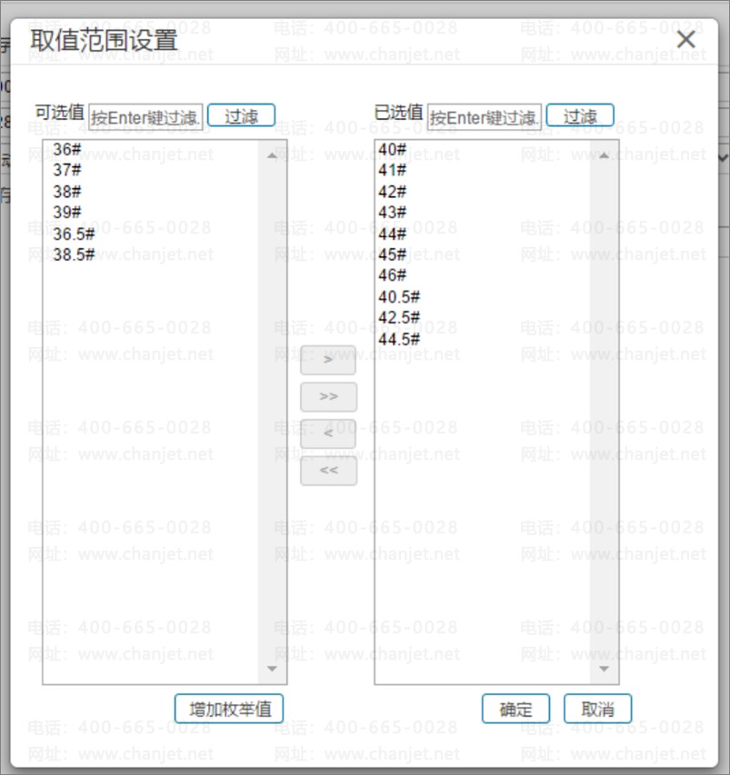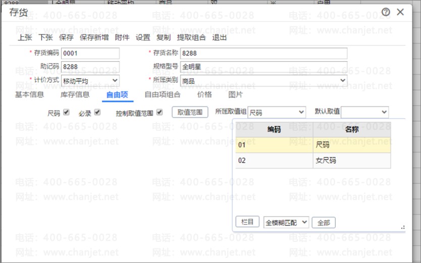 2)存货自由项设置,在存货中添加尺码的自由项并设置尺码的取值范围,针对男鞋和女鞋尺码不同但是款式颜色相同的问题,我们专门设置了相应的尺码取值组,来区分男鞋尺码和女鞋尺码。