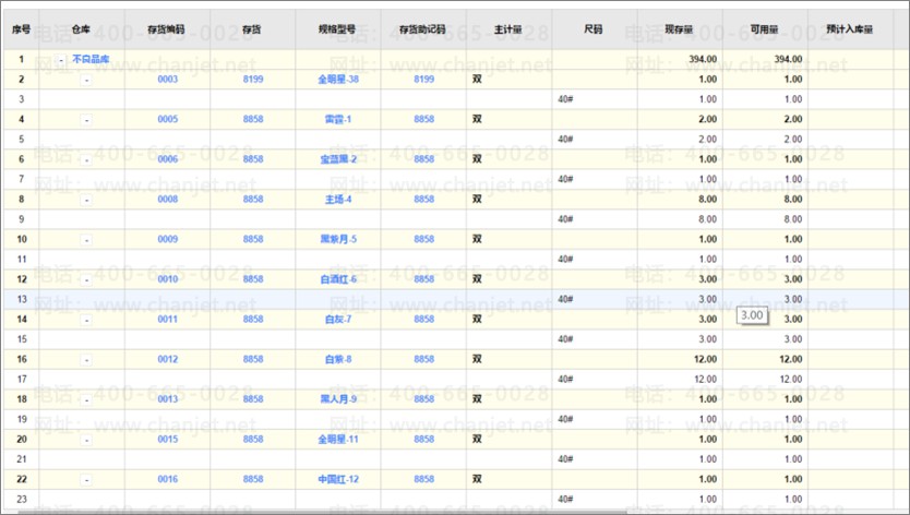 存货名作为鞋子的款式、规则型号中记录鞋子的颜色,同时在基础档案设置中添加存货尺码的自由项,实现对每双鞋子库存量的精细管理,同时仓管也可以直接按照相应的款式、颜色、尺码等快速的查询商品库存及进行日常的开单操作。