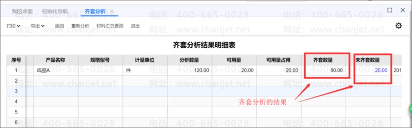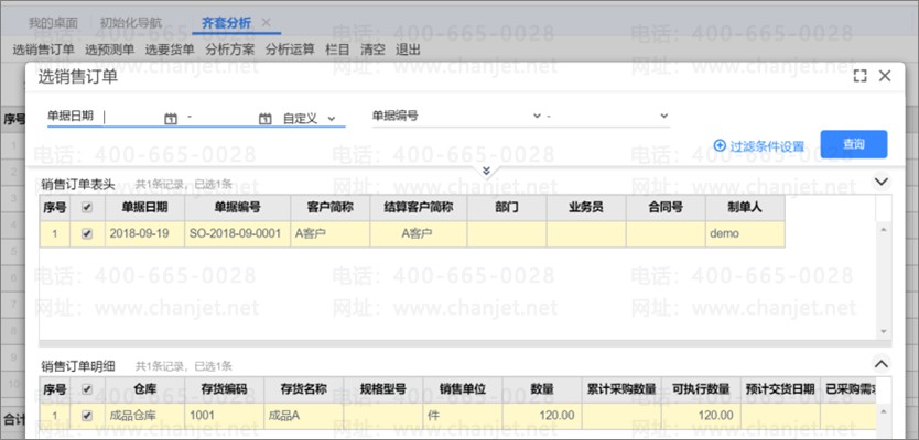 现存量与齐套分析:接单后,可以直接查询现有库存是否满足订单的需求,还可以根据加工单分析库存能否满足生产多产套产品?