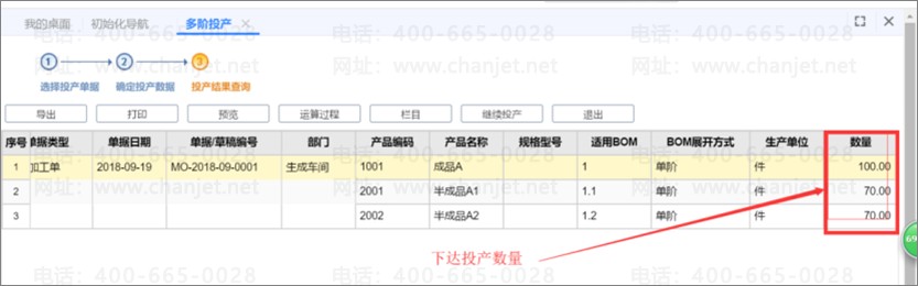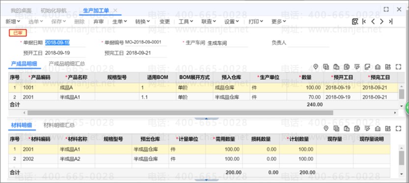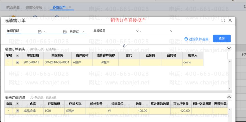 1、多阶投产:接单后,下达生产任务时,如产品有多层 BOM 结构,可自动展开多层 BOM