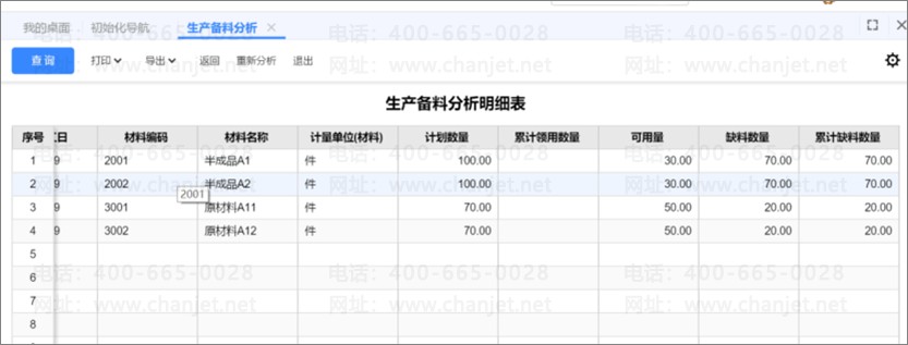 备料分析:安排生产计划时,看一下当前要安排的加工单,材料库存有多少,是否缺料?缺什么料,缺多少?不因缺料而停工,也不因备料而积压