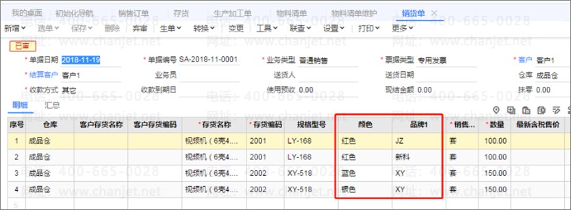 4、销售出库时,根据实际生产的库存颜色等输入自由项