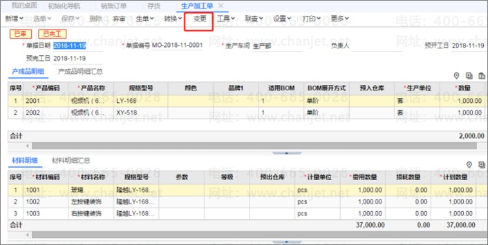 2、PMC 人员下达生产订单,根据库存情况指定生产各颜色数量。如生产可过程中材料有缺少且可替代的,能过生产订单变更修改或添加相关材料。