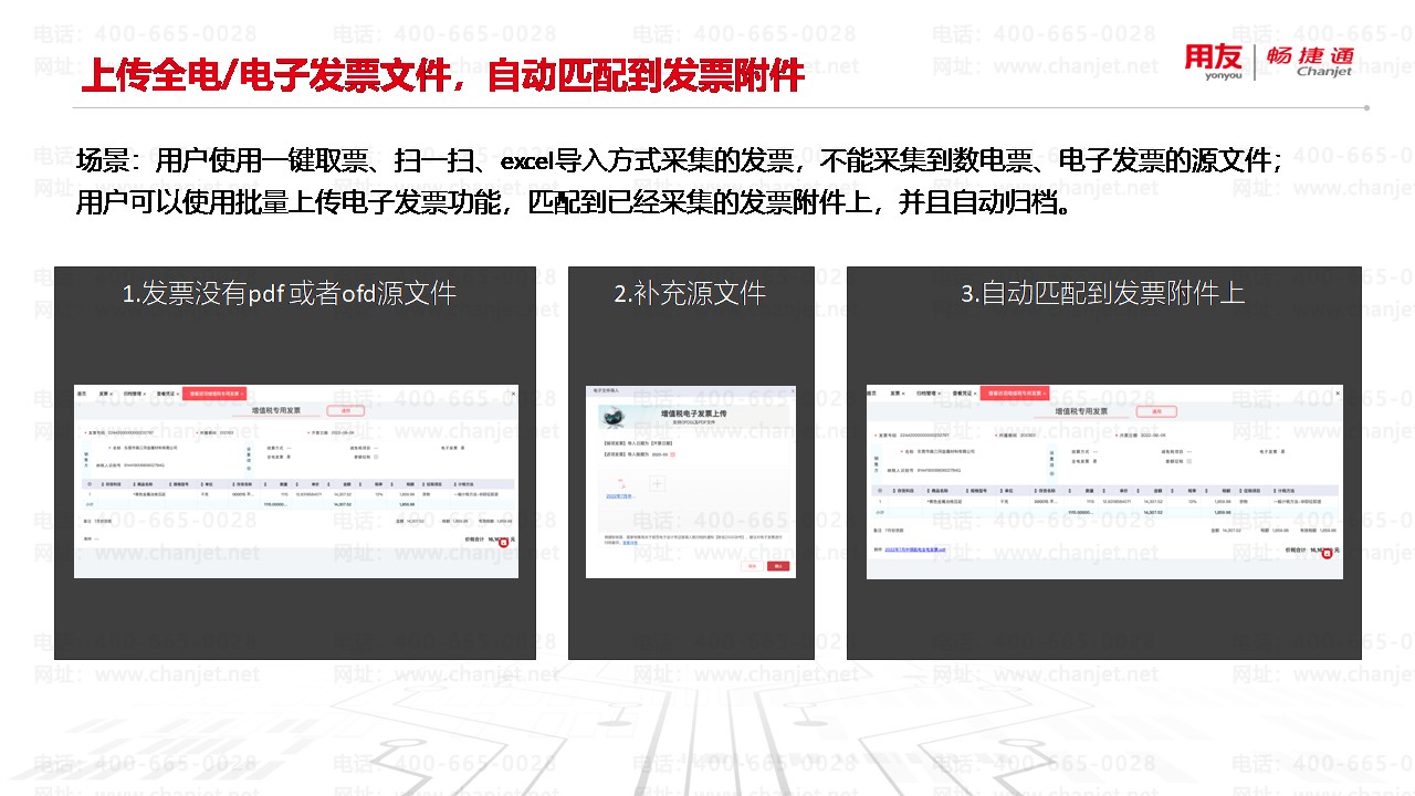 用户可以使用批量上传电子发票功能,匹配到已经采集的发票附件上,并且自动归档。