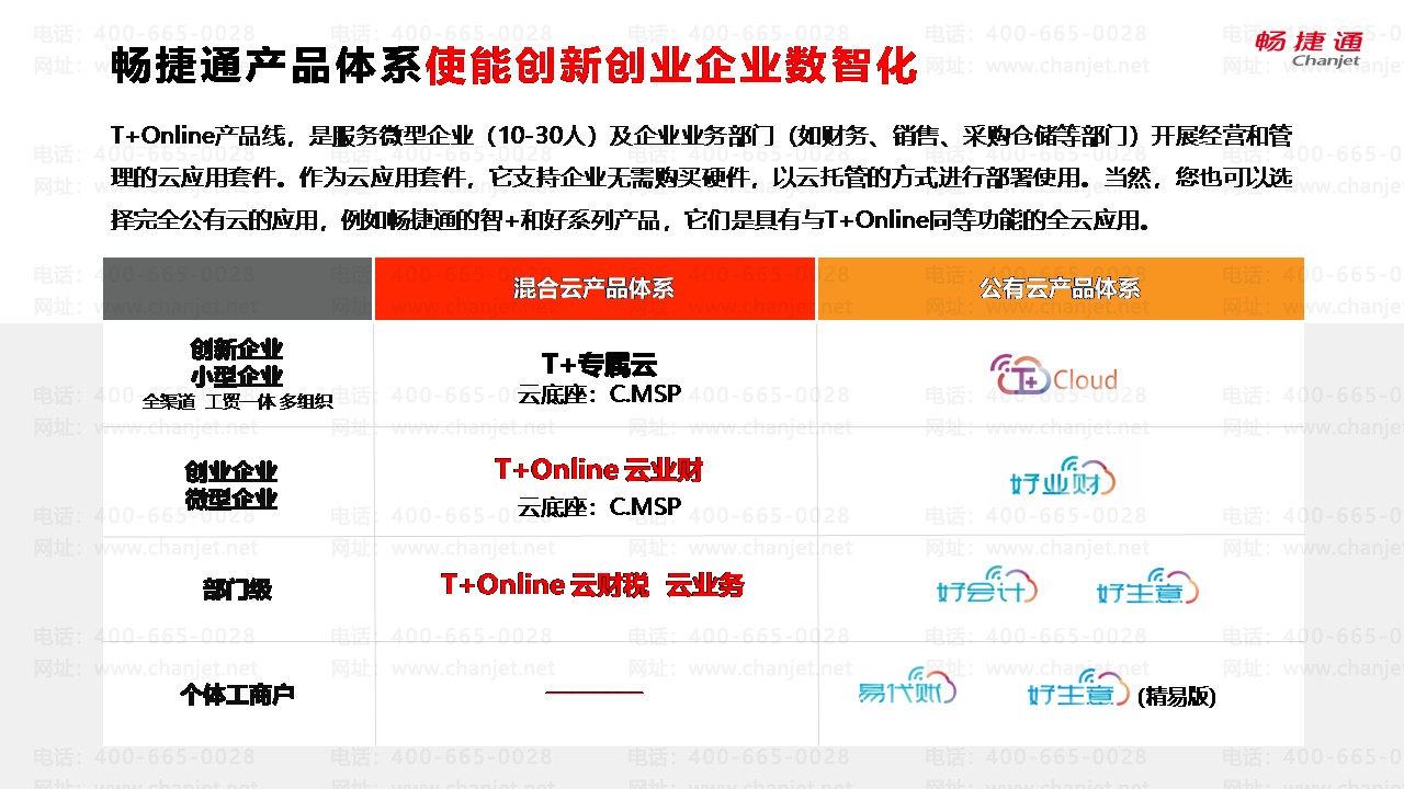 T+Online产品线,是服务微型企业(10-30人)及企业业务部门(如财务、销售、采购仓储等部门)开展经营和管理的云应用套件。作为云应用套件,它支持企业无需购买硬件,以云托管的方式进行部署使用。当然,您也可以选择完全公有云的应用,例如畅捷通的智+和好系列产品,它们是具有与T+Online同等功能的全云应用。