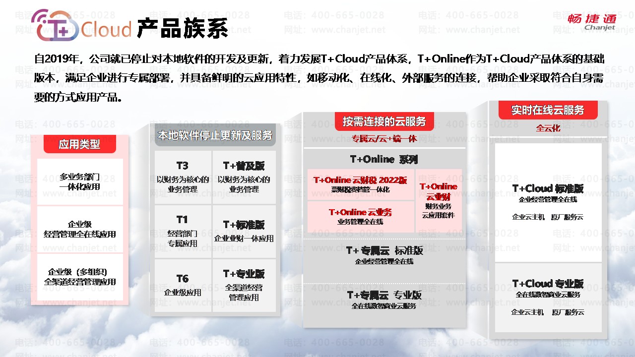自2019年,公司就已停止对本地软件的开发及更新,着力发展T+Cloud产品体系,T+Online作为T+Cloud产品体系的基础版本,满足企业进行专属部署,并具备鲜明的云应用特性,如移动化、在线化、外部服务的连接,帮助企业采取符合自身需要的方式应用产品。