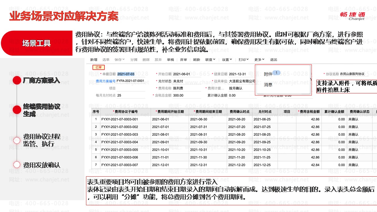 费用协议:与终端客户洽谈陈列活动标准和费用后,与其签署费用协议。此时可根据厂商方案,进行参照,针对不同终端客户,快速生单。将费用计提依据前置,确保费用发生有据可依,同时确保与终端客户进行费用协议的签署具有规范性,补全业务信息流。‘