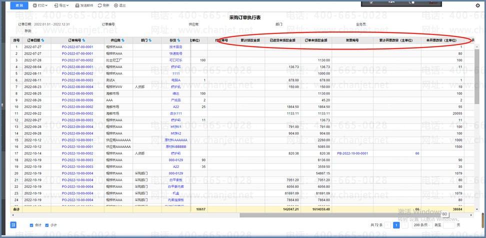 订单执行表:以源头单据查询后续所有的入库、付款、开票情况等等。