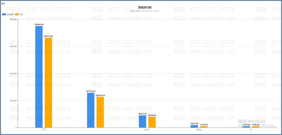 可按业务员、存货、客户等多维度方向进行查询,统计各类销售排行情况,也可通过可视化的图标展现出来。