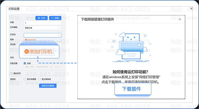下载“畅捷网络打印”插件,安装后添加打印机,运行过程中需要保持插件在线。(打印插件需安装在Windows电脑上)。