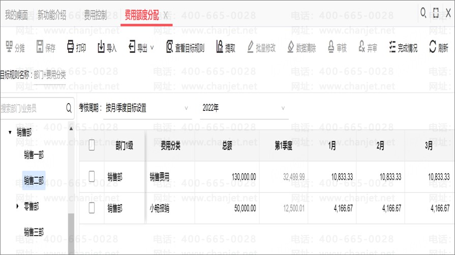 支持针对部门\人员选择费用分类或具体费用进行方案设置,进行具体费用额度的金额分配及实际发生额的查询。