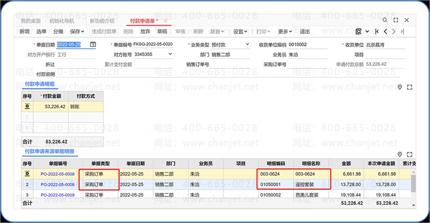 选择使用订单进行付款申请业务,后续采购订单生成的立账单据将不能再生成付款申请单。立账单据仍会确立“应付账款”,后续与该业务形成的预付款单进行“预付冲应付”或通过自动核销功能,进行货款冲抵。