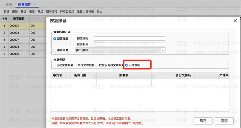 ②账套恢复时,支持直接选择云备份的账套文件恢复【云备份恢复】。