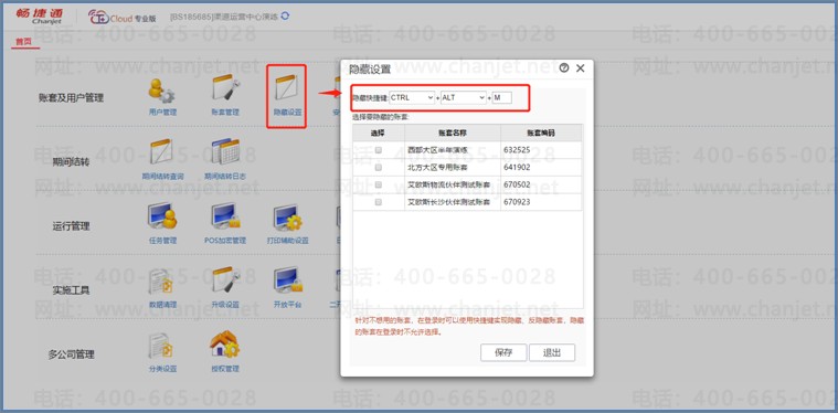 企业管理员后台进入,可以进行帐套隐藏或快捷键的方式隐藏帐套。