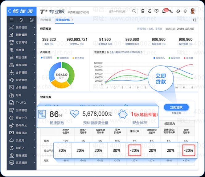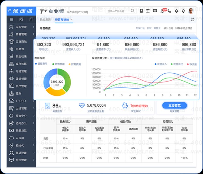 为决策层提供企业整体经营评分以及核心指标、现金流量趋势分析、健康资金预警、行业指标对比等不同维度的经营分析功能,使决策层轻松了解企业经营概貌,行业发展水平并挖掘企业经营弊病,便于决策层运筹帷幄、掌舵企业经营方向
