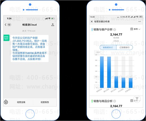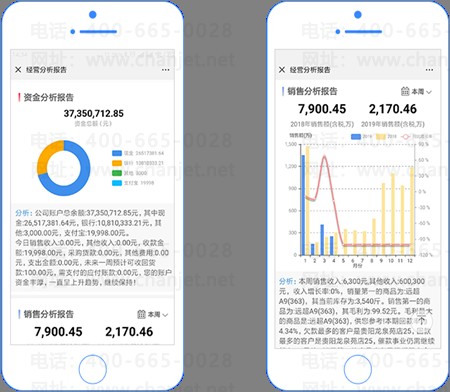 利用企业自身微信企业号、服务号进行绑定,在微信中查看企业的经营全貌、查看经营分析报表,支持定时发送企业经营相关消息,点击跳转至经营报告,使管理者可直观、即时的掌握企业经营情况的关键数据,即时进行追踪和管控。