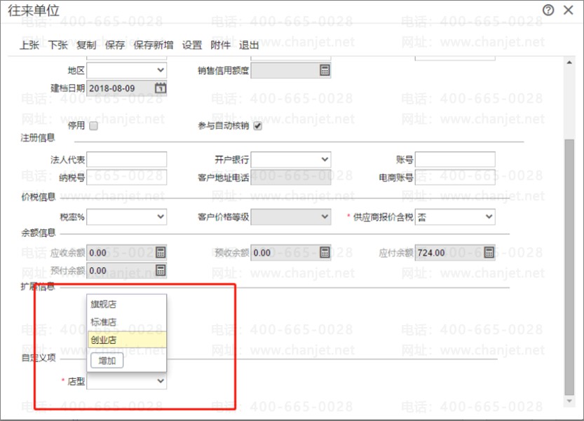 1)如图所示,在添加往来单位的时候必填项“店型”。