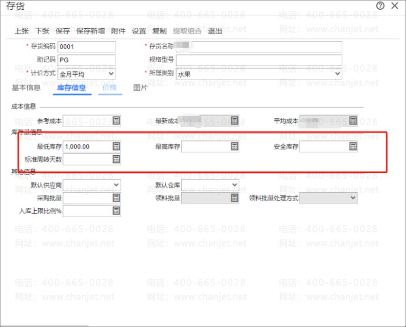 设置存货高低库存,进行预警设置