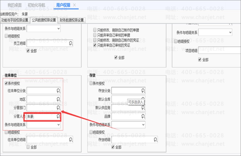 3.5 按业务员分管客户,各自只能看见自己的客户,解决办法:将所有的业务员放在一个组里面,设置权限,然后按业务员设置公共数据权限即可。