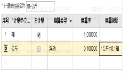 T+系统可以对一种商品设置不同属性的计量单位,如下图:牛肉有两种计量单位箱和公斤,二者之间浮动换算比例为“1 公斤=0.1 箱”(1 箱=10 公斤)。