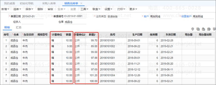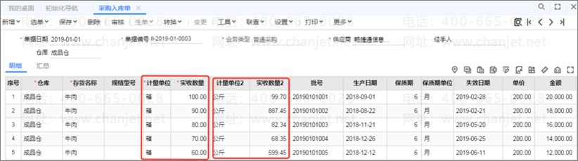 仓管员根据采购订单生成采购入库单,可同时记录牛肉的箱数、批号和净重,批号可根据单据日期、出厂日期、流水号等组合方式自动生成,净重值默认按浮动换算率自动带出,仓管员可在此基础上进行微调。同理,后续执行销售出库时,可自动带出批号,且调整出库净重。查询库存时,报表也会根据不同计量单位组合综合显示数据。