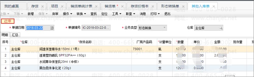 实现结果:填写形态转换单自动生成其他出库单将套盒出库和其他入库单将明细产品入库,以套盒拆单个产品为例。