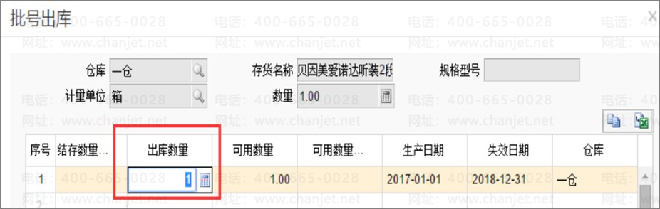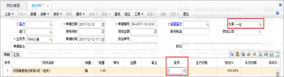 5)销售出库时,在【销货单】表体选择“批号”,选批号之前要将“仓库”确认好。系统会弹出该存货在当前仓库里所有批次的可用量。