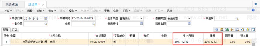 3)采购员填制【进货单】时,只需填写生产日期即可,批号自动带出,且默认等于生产日期。