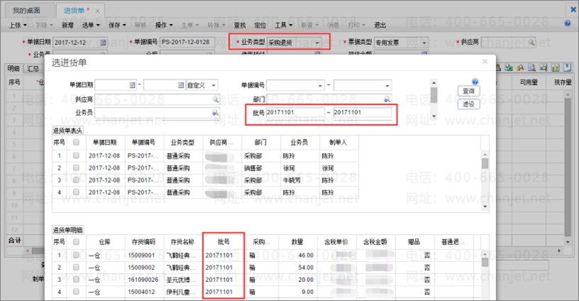 4)采购退货时,在【进货单】选单页面可根据”存货+批号”筛选出原单,保证按原单进价退回。