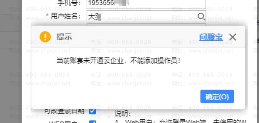 T+专属云新增用户时候提示当前账套未开通云企业,不能添加操作员