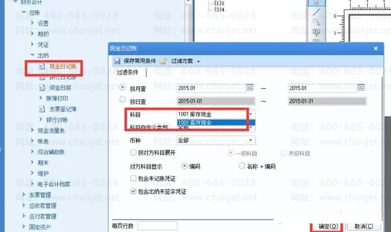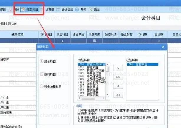 1. 操作方法:选择指定科目-现金科目,从待选科目里把现金科目放到已选科目里,如图“1001库存现金”。