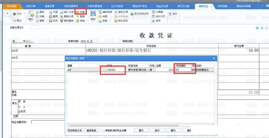 2) 在填制凭证录入分录的同时录入现金流量项目才能为以后的现金流量统计表、现金流量明细表提供数据。