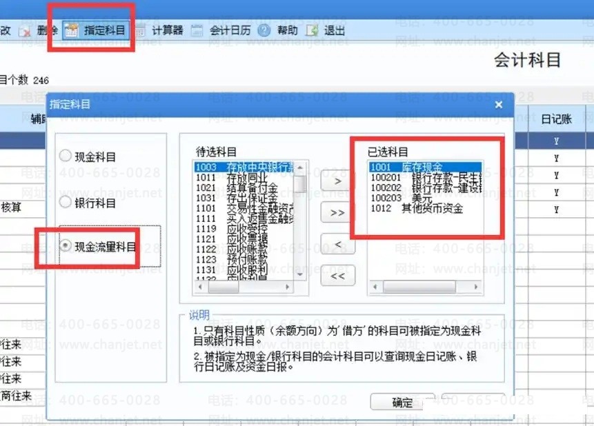 1. 操作方法:选择指定科目-现金流量科目,从待选科目里把涉及到现金流量的科目放到已选科目里。