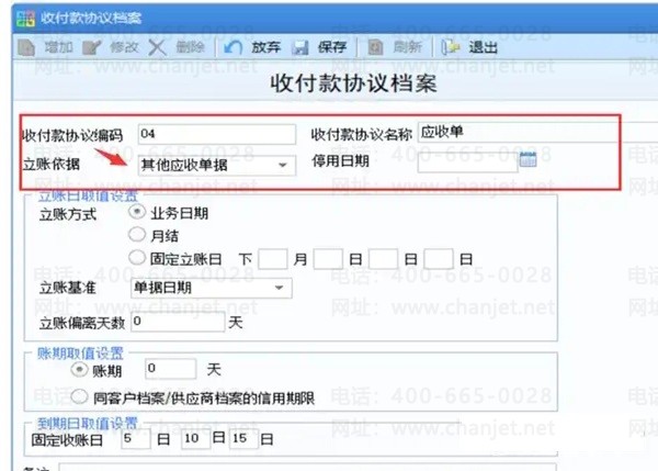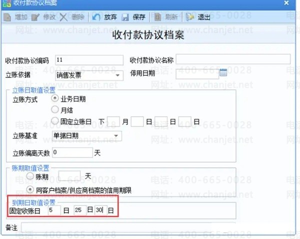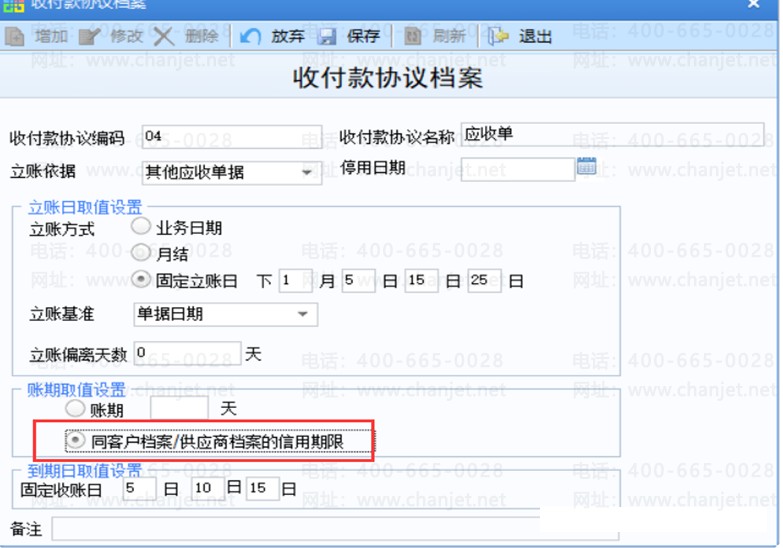 账期:手工在账期处维护一个天数。例如立账日是1月份10日,账期维护15天,则到期日计算出来的结果10+15=25日,到期日为1月25日。