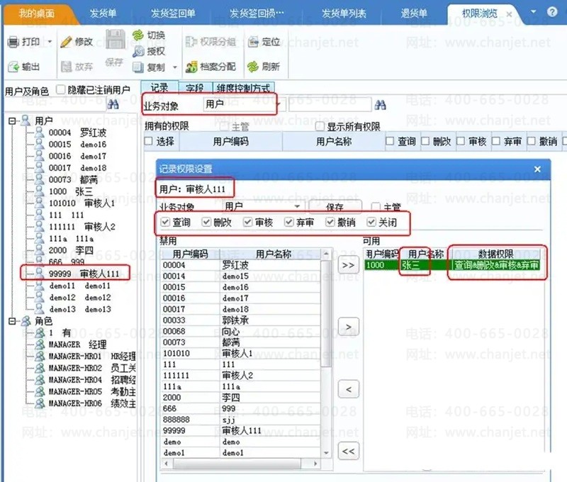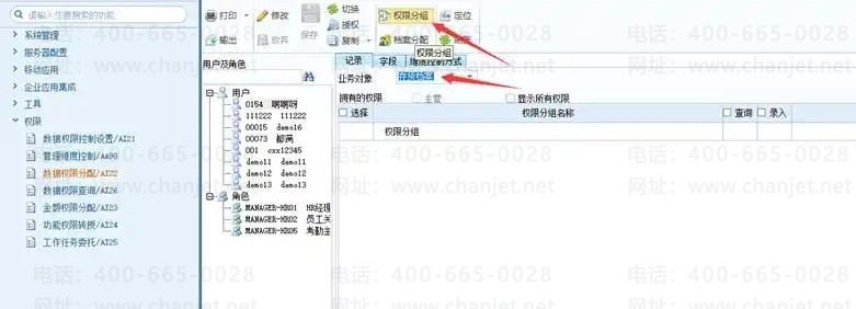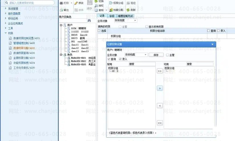 系统服务-权限-数据权限分配中业务对象选择用户,点击授权,把相关用户的权限授权给操作员,可以区分具体的查询,删改等权限