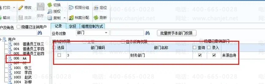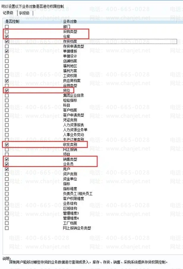 控制部门权限:检查部门权限:打勾选择,可随时修改。如检查,查询时只能显示有查询权限的部门及其记录;填制单据时只能参照录入有录入权限的部门。