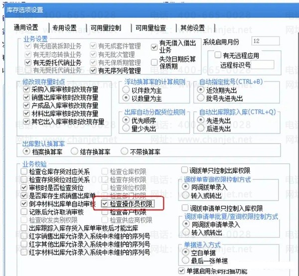 相关业务模块的选项中要勾选“检查操作员权限”。没有勾选不控制。
