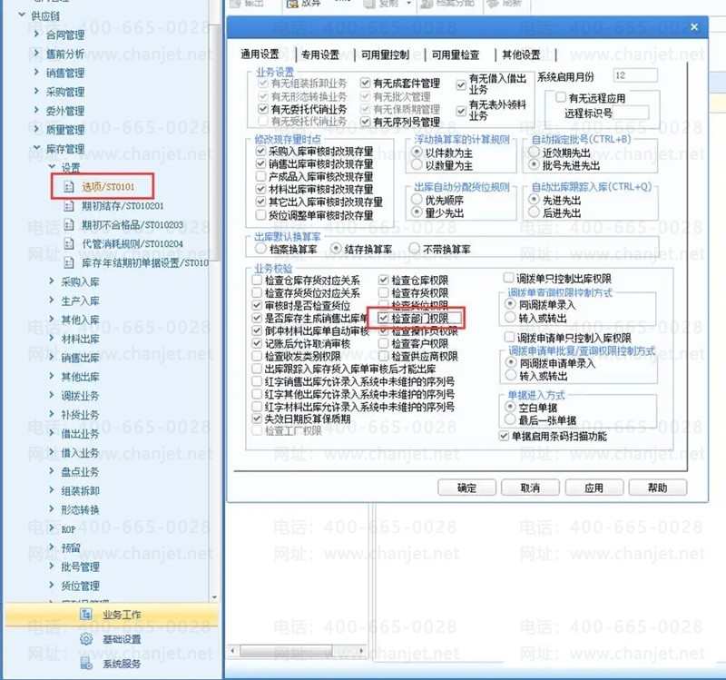 什么模块需要控制部门权限就打开对应模块的选项,勾选检查部门权限,例如库存管理模块的选项