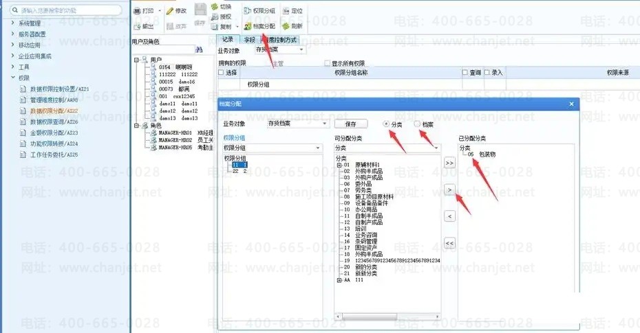 3. 点击档案分配,可以把具体的存货分类或者存货档案分配到权限组中