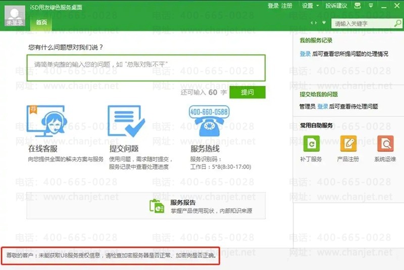 解决方案:如果服务识别码没有到期,需要将客户的公司名称,服务识别码,加密狗号反馈用友处理