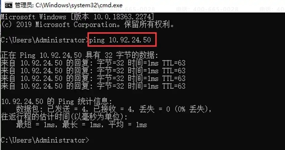 如果时间=1ms,且不存在丢包现象,表示能够正常访问服务器IP。